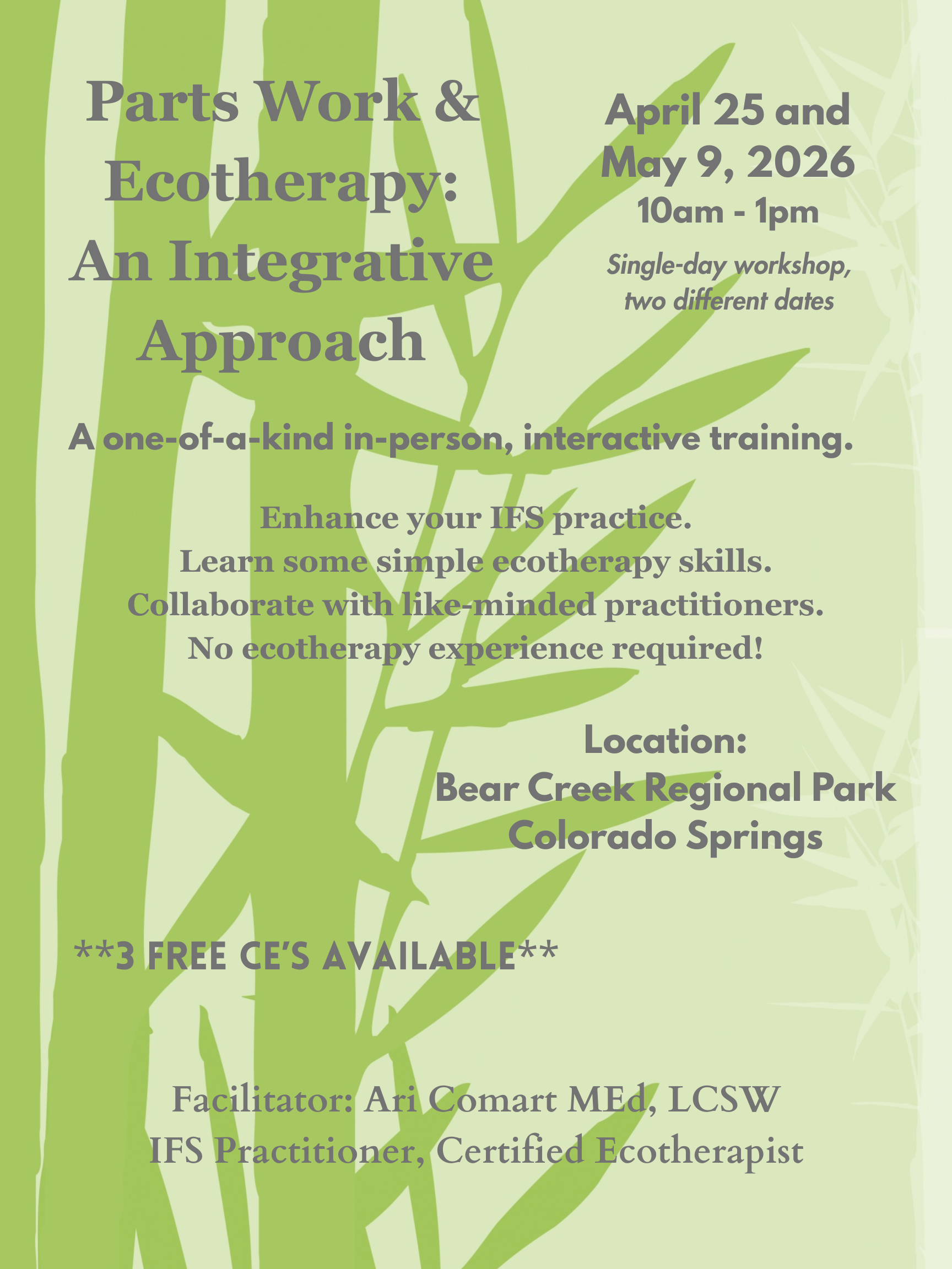 This workshop is designed for IFS practitioners. Attendees will need some prior experience with IFS or other parts work models to benefit from the training. No ecotherapy experience is required. Future workshops for non-IFS practitioners may be offered.